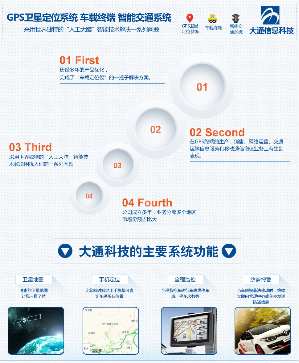 合肥大通信息科技有限公司是一家以研發、生產、銷售、服務為一體的綜合型公司。公司注重于車輛定位系統的研發、信息咨詢及技術服務;公司歷經多年的產品優化,完成了“車載定位儀”的一攬子解決方案。 公司以GPS衛星定位系統、車載終端、智能交通系統為主要研發對象,并繼續促進科研成果產業化,在GPS終端的生產、銷售、網絡運營、交通運輸信息服務和移動通信增值業務上有獨到表現。 公司產品采用“人工大腦”智能技術解決汽車調度、軌跡、里程、油耗統計、防盜等困擾人們的一系列問題。 公司現在業務分布情況:安徽合肥、蕪湖、滁州、六安、宿州、阜陽、黃山、池州、銅陵、安慶、馬鞍山、宣城、亳州、巢湖、蚌埠、淮南、淮北、江蘇南京、福建廈門、江西南昌、湖北武漢、四川成都等各個地方。